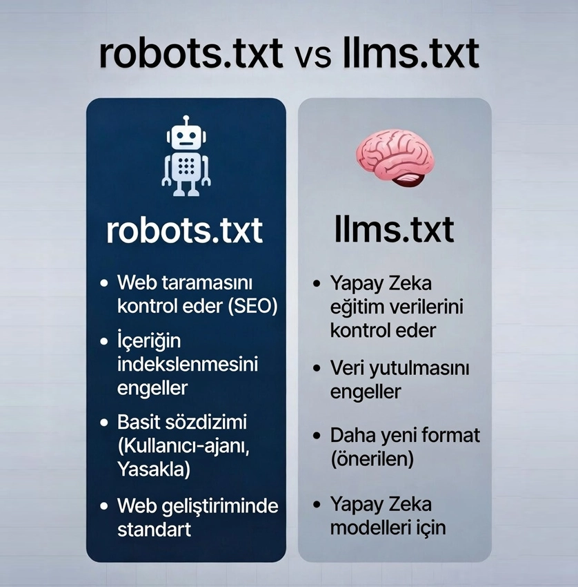 | robots.txt farkı | Arama motorlarına değil, LLM'lere yöneliktir |